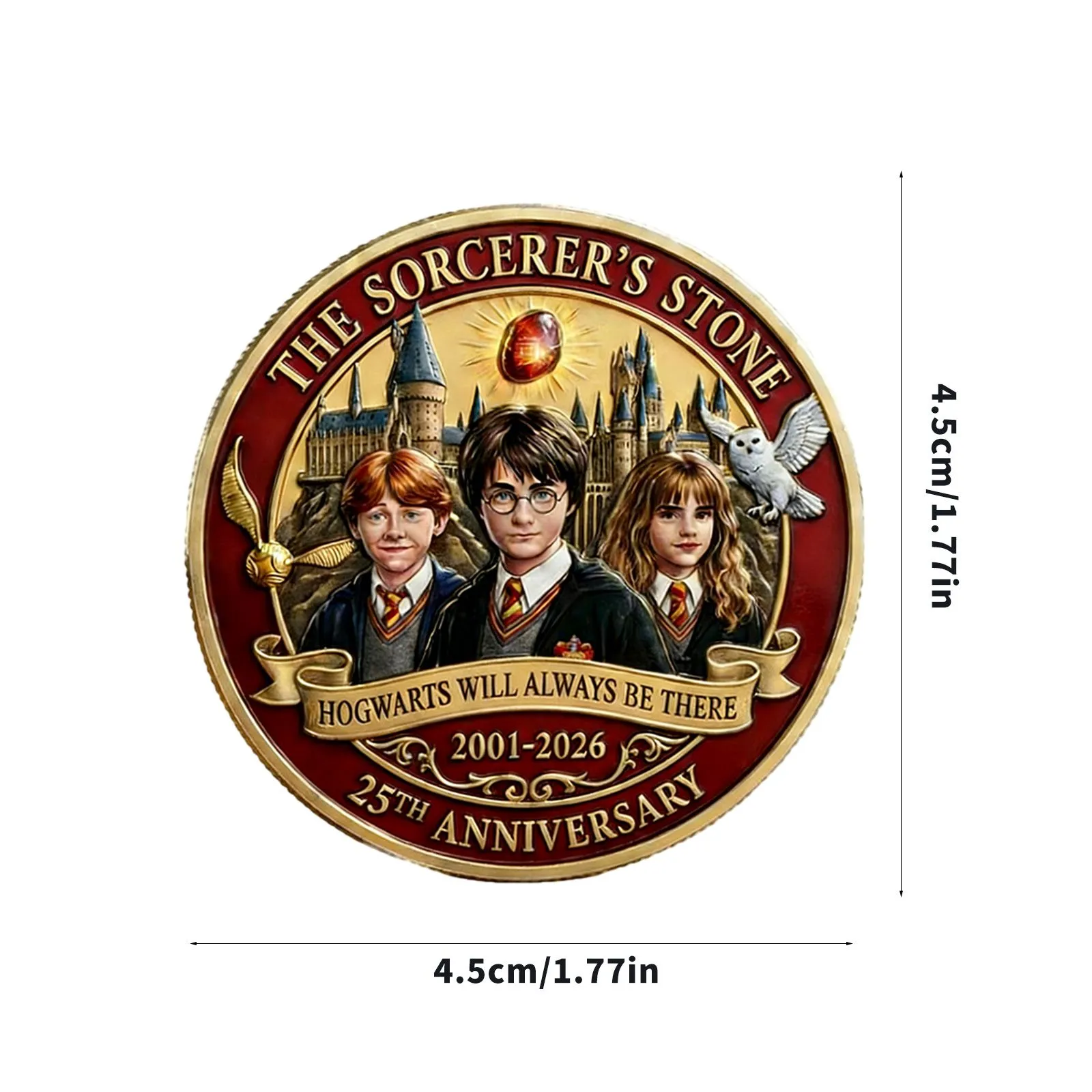 Celebrate 25 years of wizarding magic (2001–2026) with this exclusive collectible coin, a heartfelt tribute to the beloved film that introduced the world to Hogwarts. Designed for die-hard Harry Potter fans and collectors alike, this coin captures the timeless bond of friendship between Harry, Ron, and Hermione, and the enduring magic of the wizarding world.