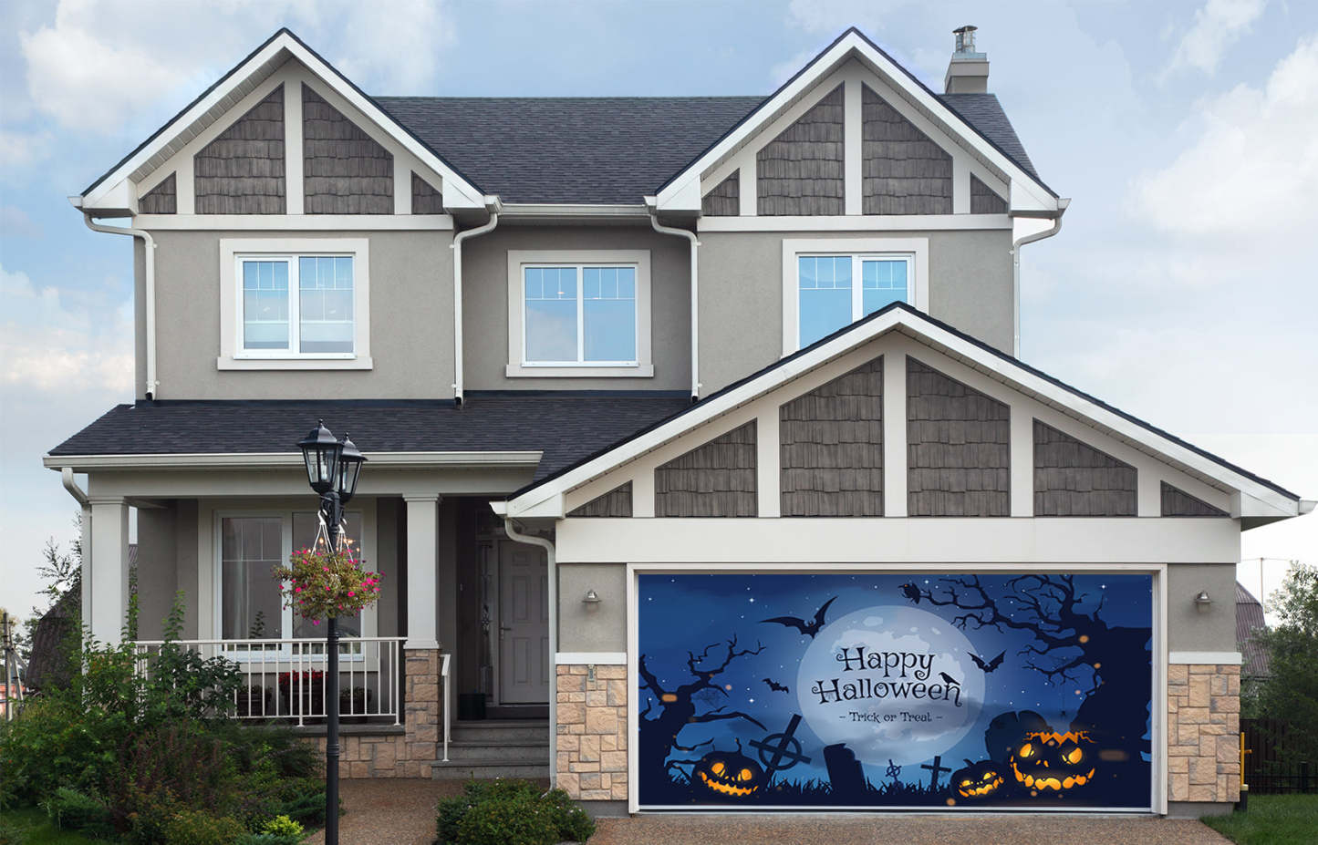 Happy Halloween with Blue Fog Clouds and Pumpkins Garage Door Cover Banner Backdrop